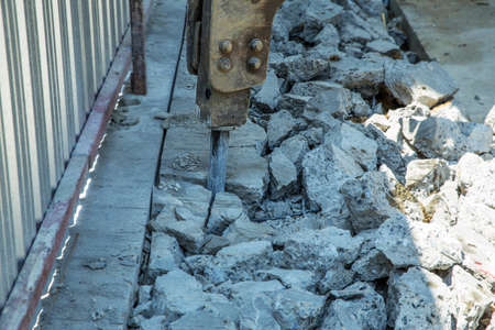 Close-up of demolition hammer with dust and sparks and broken concrete pieces. Detail of hydraulic jackhammer mounted on excavator arm working at old road reconstruction. Repairs.