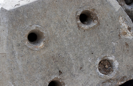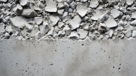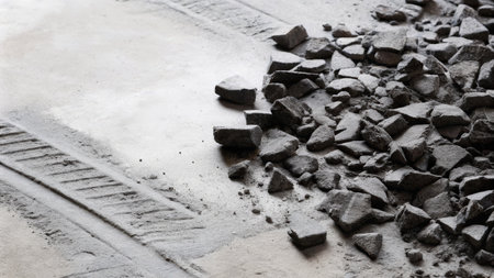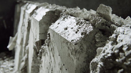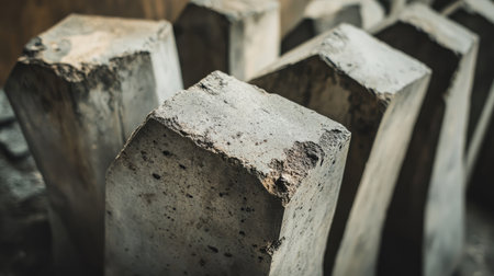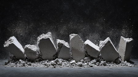 Rough cement fragments in a line, showcasing cracked surfaces, dust, and rugged textures for a construction theme