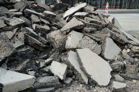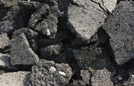 Repair of the road surface. A pile of stones made of old asphalt lies on the road. Textured abstract background. Close-up