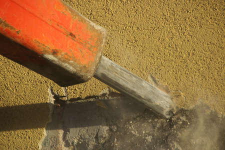 Close up view of a heavy-duty jackhammer breaking concrete at a construction site. Dust fills the air as the equipment presses down into the surface. The activity shows an ongoing building project.