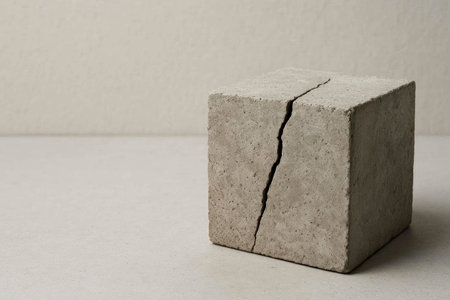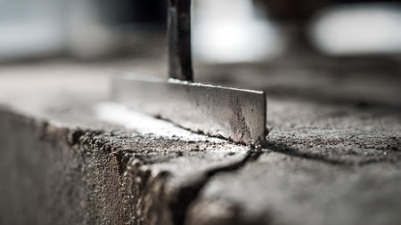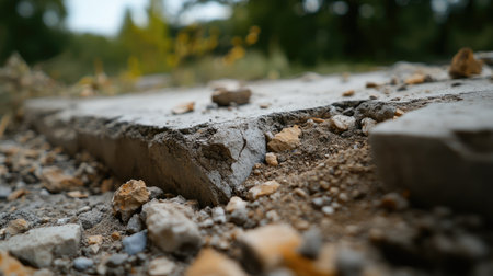 Close-up of broken cement fragments aligned in a line, highlighting rough edges, cracks, and a raw construction feel