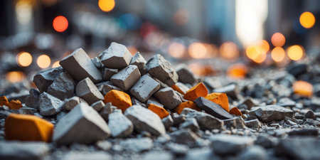 Close-up of rough cement fragments scattered in a line, showing sharp edges and raw texture in a construction scene