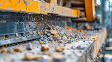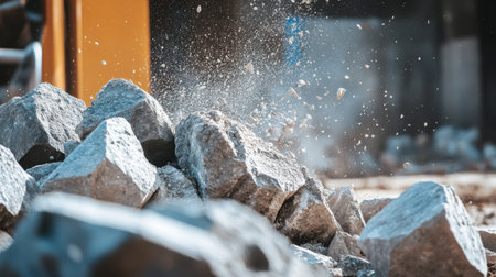 A dynamic scene featuring a pile of rocks being chipped away, with dust and debris scattering in the air, highlighting the action and intensity of a construction site environment.