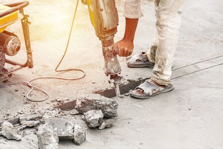 A construction worker using a jackhammer to break up concrete, highlighting the intensity and effort involved in the job.