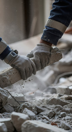 Man hands with gloves picking up concrete debris after disaster. Emergency rescue worker cleaning earthquake aftermath rubble. Reconstruction concept.