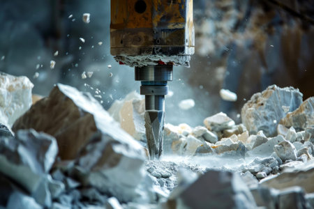 A dynamic scene capturing an electric drill breaking through concrete at a construction site. Dust and gravel fly as a worker operates the machinery, emphasizing labor and innovation.