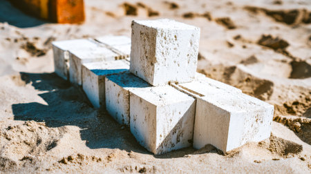 A cluster of aged, chipped white bricks rests unevenly on golden sand, basking under a blazing sun, evoking rustic charm and sun-soaked desert landscapes.