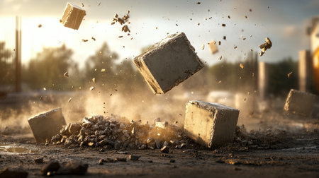 An urban construction site showcases fallen concrete blocks amidst dust clouds rising from the ground, highlighting progress and demolition impact.