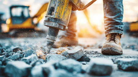 A dedicated construction worker operates a jackhammer at a building site as the sun sets, illuminating heavy machinery and creating dust clouds.