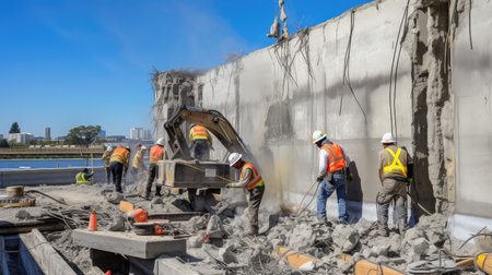 damage concrete wall repair illustration structural safety, machinery workers, gear removal damage concrete wall repair