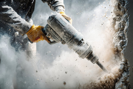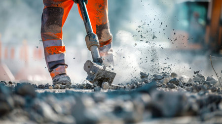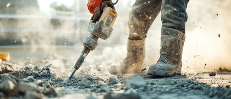 A worker skillfully operates an electric jackhammer, breaking through concrete with precision, surrounded by dust and debris. Safety gear highlights the intense labor.