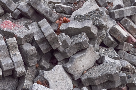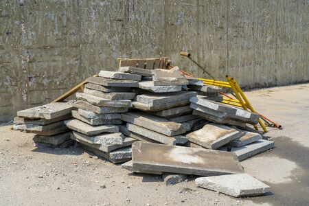 Broken concrete blocks on construction site. Selective focus. Toned.
