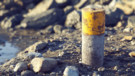 A weathered marker stands alone on a rocky shoreline, featuring a bright yellow top that contrasts with its concrete base. Perfect for outdoor and nature-themed projects.