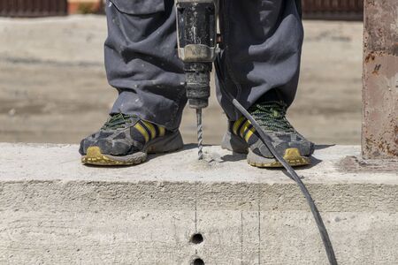 He removes the asphalt with a jackhammer. Removing the asphalt layer from the road. The worker holds a jackhammer. Road repair. Using an electric hammer.