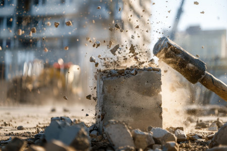 Dramatic Sledgehammer Impact on Concrete Slab at Construction Site for Industrial Design