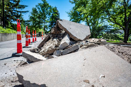 Sidewalk being replaced and old slabs broken and pilled at construction site.