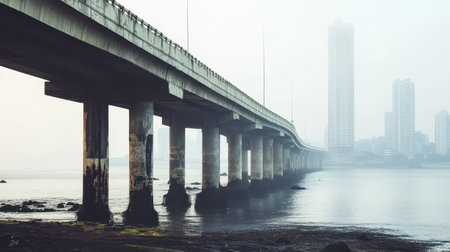 A bridge extends over still water its pillars reflected in the foggy atmosphere. Tall buildings loom in the background shrouded in mist.