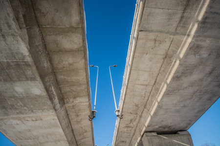 A stunning low-angle shot of a massive bridge against a bright blue sky. Represents civil engineering, architecture, and infrastructure.
