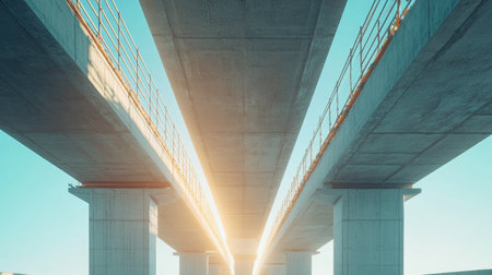 A concrete bridge dominates the composition, extending across tranquil water. The image features a low-angle perspective with dramatic lighting, showcasing textures of concrete and water. The color palette includes shades of blue, orange, and gray, suggesting a dusky environment. Suitable for various commercial and editorial applications.