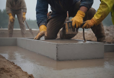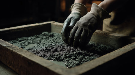 A worker in muddy boots pours concrete onto the ground, creating an industrial atmosphere with warm light reflections and a cinematic tone.