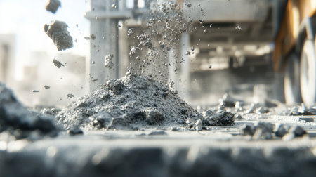 Dynamic view of concrete and dirt at a construction site, showcasing heavy machinery and the groundwork process in action. Perfect for industry visuals.