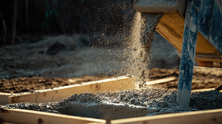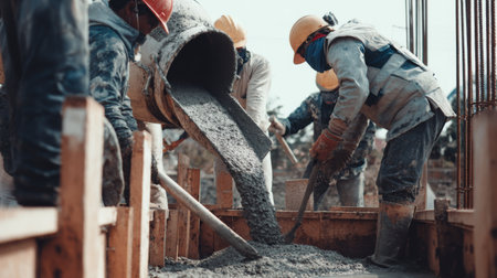 Workers skillfully direct a steady stream of concrete from a high chute into a prepped urban mold, laying the groundwork for modern infrastructure.