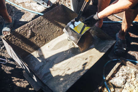 Workers work with cement mortar, loading the hopper bucket with mortar with a shovel.