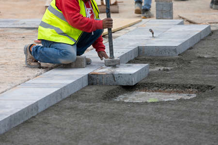 Man is laying bricks and using a trowel to spread mortar. Concept of hard work and dedication to the task at hand