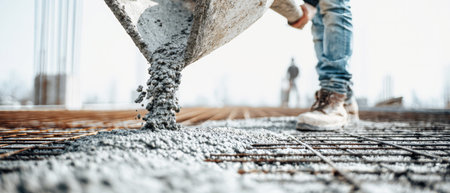 Worker skillfully pours concrete onto a reinforcing mesh at a busy construction site, capturing the essence of craftsmanship under soft lighting conditions.