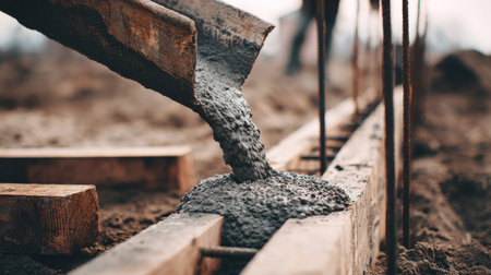 The image captures the essential moment of concrete being poured into wooden formwork at a construction site, illustrating the craftsmanship and industrial process involved in building.