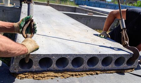 A group of construction workers collaborated to install a large concrete slab, showcasing teamwork and safety as they work under bright daylight.