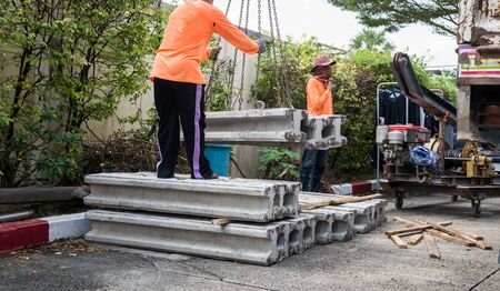 Large reinforced concrete structures at the construction site. Preparation for the installation of reinforced concrete products. Construction work on the construction of foundations