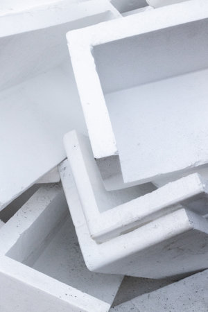 Weathered concrete cinder blocks arranged outdoors, revealing rugged surface details and precise rectangular forms under a subdued, cloudy sky.