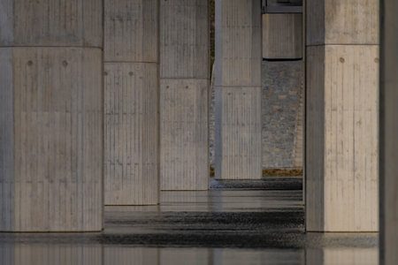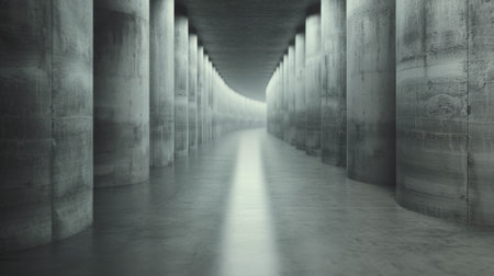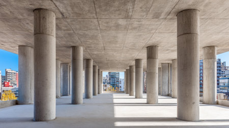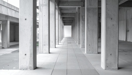 A captivating view of modern concrete architecture showcasing a series of symmetrical columns in an expansive interior space, emphasizing minimalism.
