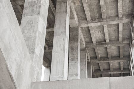 Industrial building site with reinforced concrete columns and beams, copy space left around frame