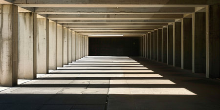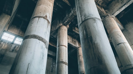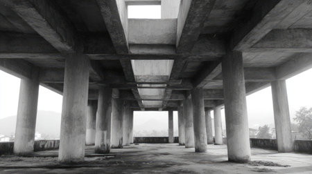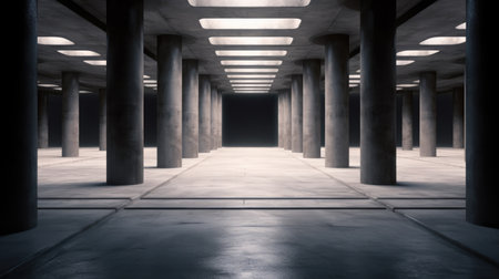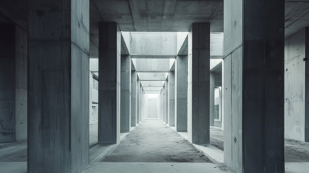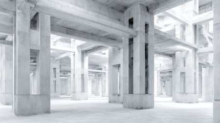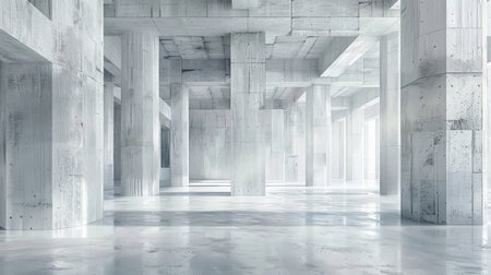 Spacious industrial interior featuring concrete columns and beams creates a modern, minimalistic aesthetic. Ideal for architectural themes and urban environments.
