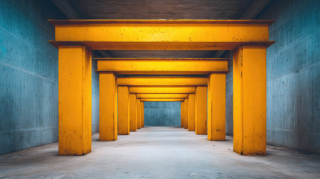 This image features a striking arrangement of bright yellow pillars in a spacious concrete environment, highlighting modern architectural design and minimalistic beauty.
