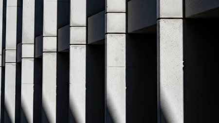 This abstract image captures striking architectural lines and shadows, showcasing minimalist design in a contemporary urban setting with an emphasis on geometry.