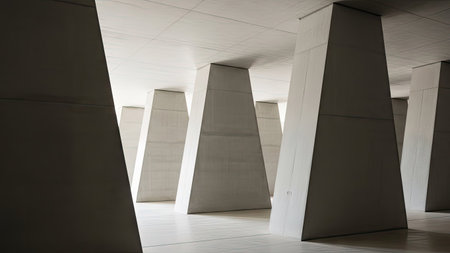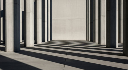 Explore a striking minimalist concrete space featuring strong pillars and beams that emphasize symmetry and light, creating an industrial yet serene environment.