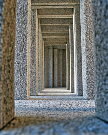 The view captures a long corridor formed by textured concrete blocks, creating lines that recede into the distance, illuminated by natural light, showcasing architectural symmetry.
