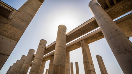Captivating view of concrete pillars supporting a highway overpass, showcasing an architectural marvel against a bright sky in an urban setting.