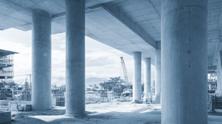 Close-up view of sturdy concrete pillars under construction, highlighting the essential support structures in an urban building project, featuring raw materials and craftsmanship.