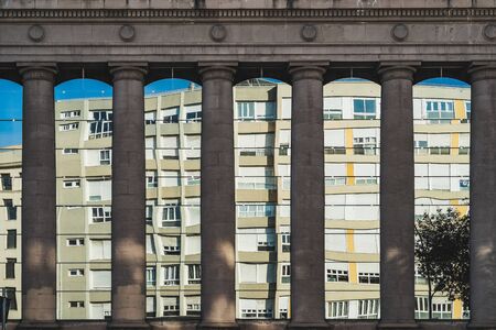Modern residential building reflected between the doric columns of a pavilion from the universal exposition of 1929 in Barcelona