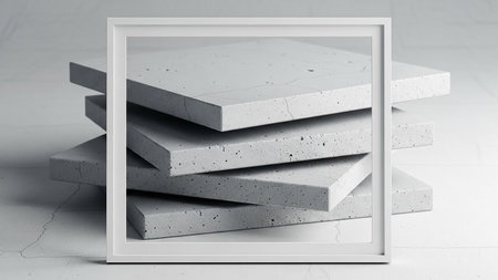 Stacked concrete slabs with a rough texture are displayed within a white frame. Clear details and vibrant colo...