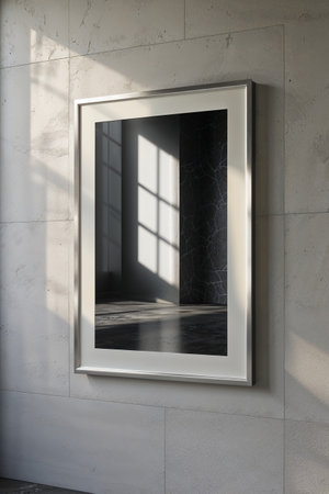Minimalist vertical blank frame hanging on a light gray textured wall, illuminated by gentle natural sunlight streaming from the side. The empty canvas offers space for custom artwork, posters, or design presentations, making it a versatile interior decor mockup.