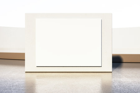Blank white billboard on a clean concrete surface, surrounded by a minimalistic exterior with light background. Concept of advertising space. 3D Rendering.