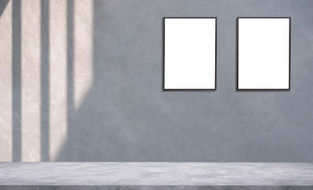 Background of light and shadow on surface of 2 blank picture frames on cement wall with concrete floor in loft style for editing products display and text present on free space backdrop