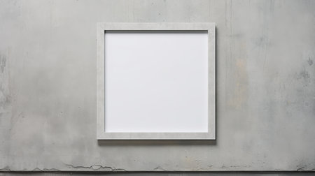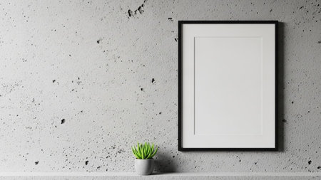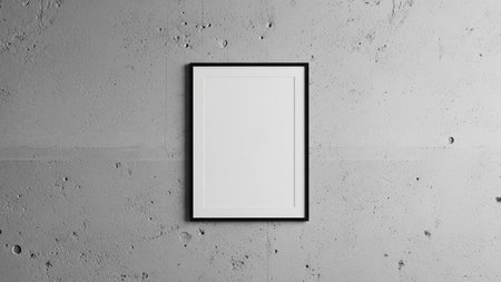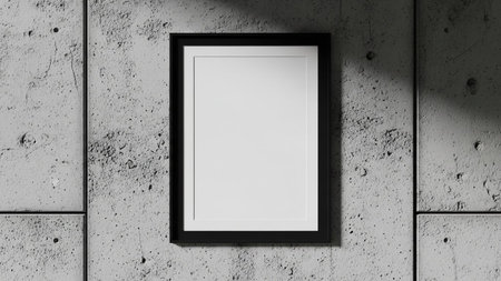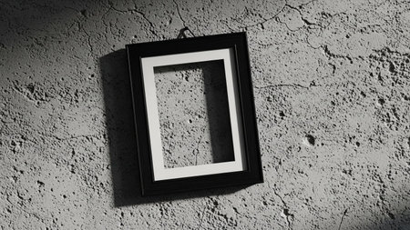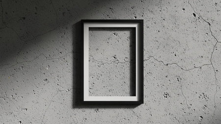 An empty black framed hangs centered on a rough, textured concrete wall, illuminated by dramatic light and shadow.