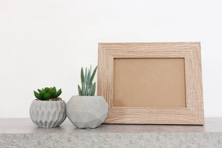 A picture frame hanging on a wall in a room. Frame mockup with copy-space.