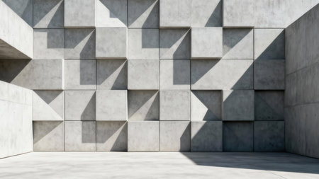 Brutalist gray architectural outdoor space with a volumetric accent wall made of rough concrete square tiles casting abstract triangular shadows on the rigid surface.
